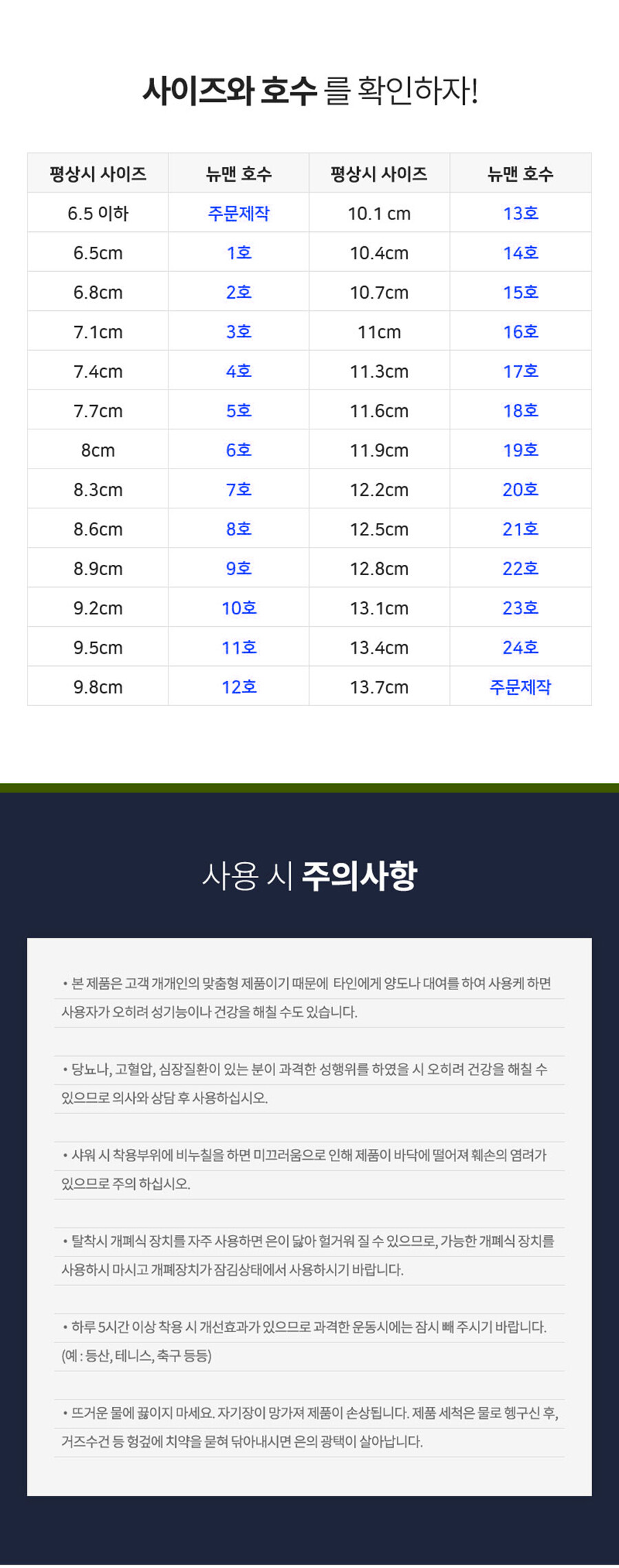 뉴맨프로 착용시 주의사항 1. 본 제품은 고객 개개인의 맞춤형 제품이기 때문에 타인에게 양도나 대여를하여 사용케 하면 사용자가 오히려 성기능이나 건강을 해칠 수도 있습니다.2. 당뇨나, 고혈압, 심장질환이 있는 분이 과격한 성행위를 하였을 시 오히려 건강을 해칠 수 있으므로 의사와 상담 후 사용하십시오.3. 샤워시 착용부위에 비누칠을 하면 미끄러움으로 인해 제품이 바닥에 떨어져 훼손의 염려가 있으므로 주의 하십시오.4. 탈착시 개폐식 장치를 자주 사용하면 은이 닳아 헐거워 질 수 있으므로, 가능한 개폐식 장치를 사용하시 마시고 개폐장치가 잠김상태에서 사용하시기 바랍니다.5. 하루 5시간 이상 착용 시 개선효과가 있으므로 과격한 운동시에는 잠시 빼 주시기 바랍니다. (예 : 등산, 테니스, 축구 등등)