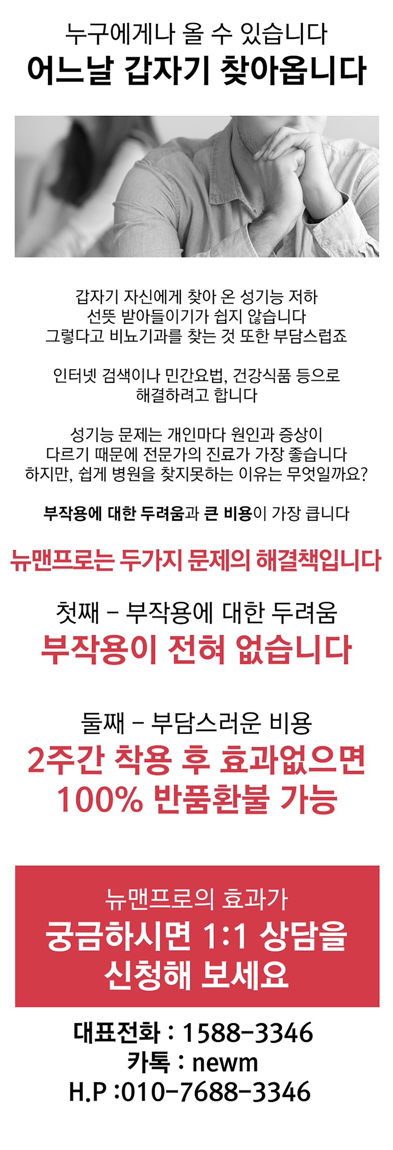 뉴맨착용으로 발기력 강화 조루 확대 강직도, 잔뇨감, 빈뇨감 등 모든 기능이 개선되니 얼른 착용해서 효과 보세요.
