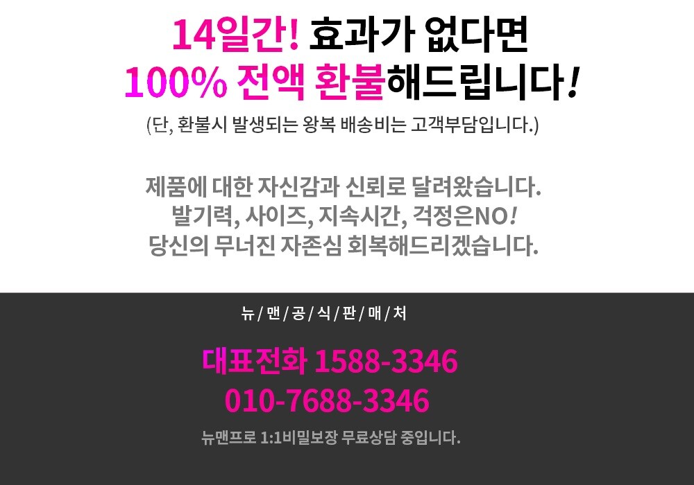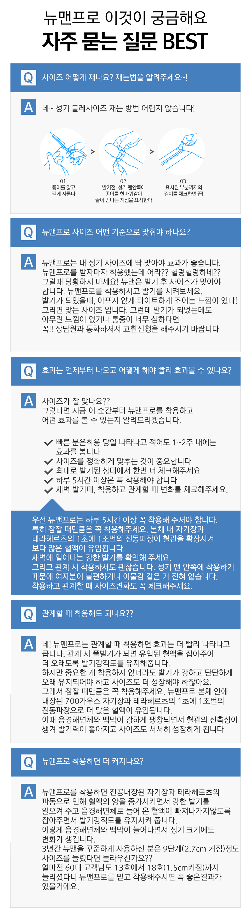 * 뉴맨프로를 사용하면서 사이즈와 효과부분은 꼭 담당자와 상의 후 사이즈를 교체 하시거나 효과를 보실수 있도록 도움을 받으시기 바랍니다. 특히 사이즈교환은 한달이내 3회 교환이 가능 하니 본인이 사이즈를 결정하셔서 교환 하신는 것보단 담당 상담원과 상담 후 교환을 하시는게 더욱 좋습니다.